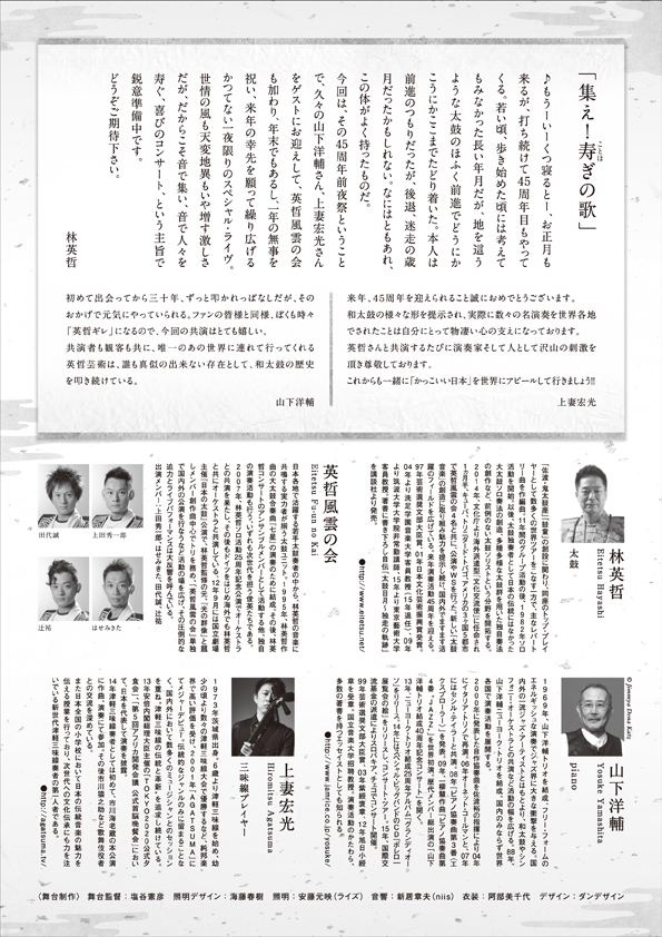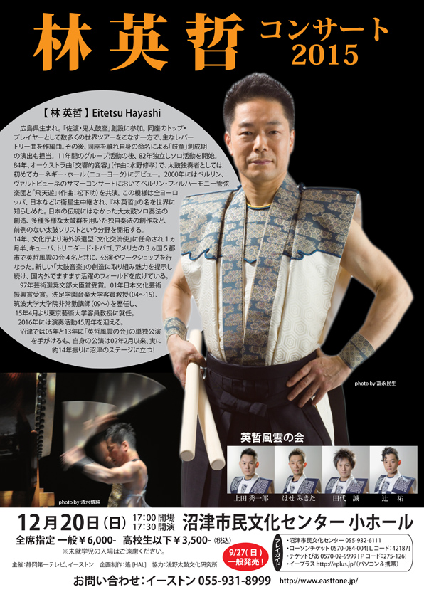 会場:静岡・沼津市民文化センター 開演:17:30 出演:林 英哲、英哲風雲の会〈上田秀一郎、はせみきた、田代 誠、辻 祐〉 問い合わせ:イーストン 055-931-8999