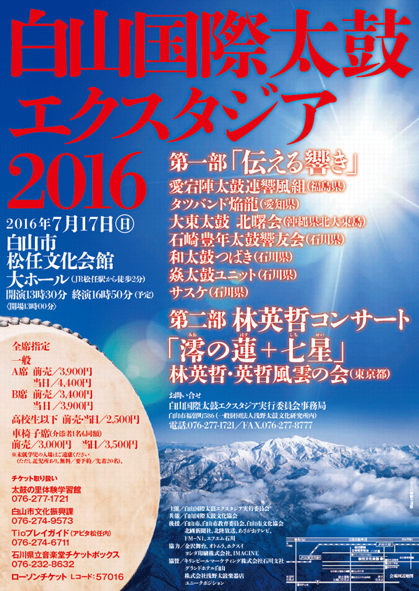 問い合わせ:白山国際太鼓エクスタジア実行委員会事務局 076-277-1721
