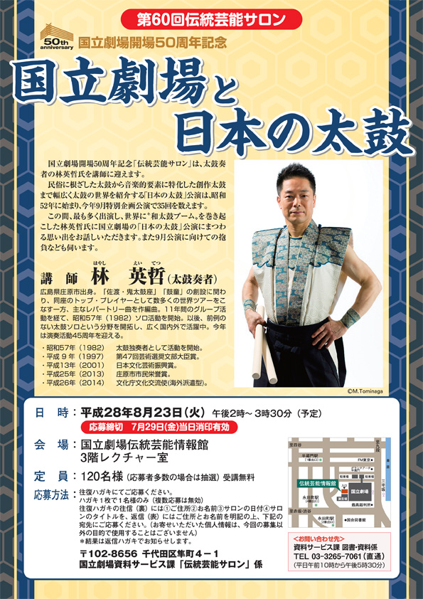 会場:東京・国立劇場伝統芸能情報館3階 レクチャー室 開演:14:00 講師:林 英哲 募集:要申込 定員120名(応募者多数の場合抽選) 受講無料 応募締切:7月29日(金)消印有効 ※1人につき1通