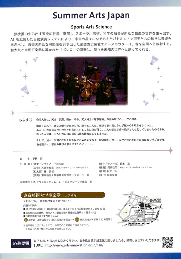 会場:東京藝術大学奏楽堂(大学構内) 開演:15:00 出演:小林沙羅(ソプラノ)、天満谷龍生、岡崎弘司(東京ノーヴイレパートリーシアター)、 林 英哲(和太鼓)、東京藝術大学卒業生有志オーケストラ 問い合わせ:一般社団法人アーツ・イノヴェーション・プロジェクト 03-6276-1177 cp@arts-innovation.co.jp 詳細は東京藝術大学HPをご覧ください。