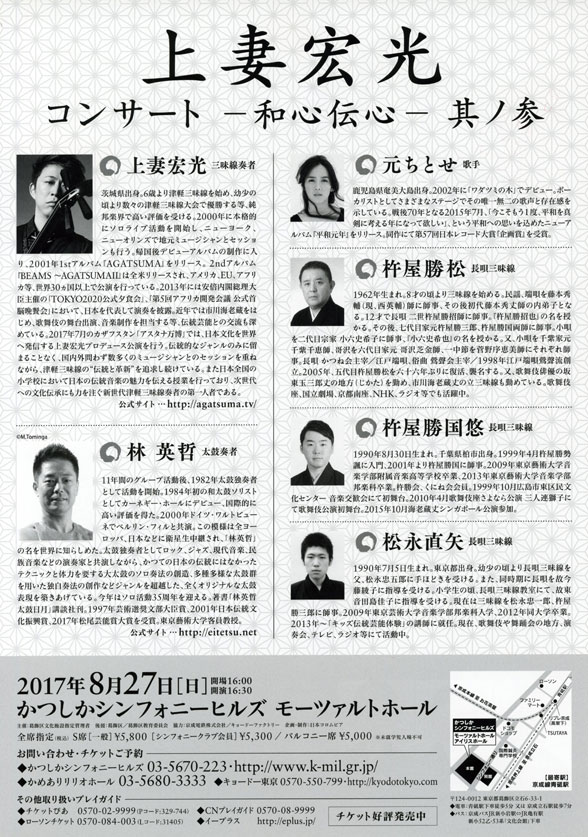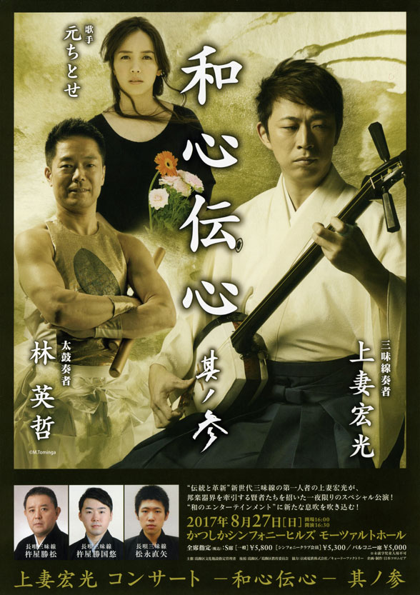 会場:東京・かつしかシンフォニーヒルズ モーツァルトホール 開演:16:30開演 出演:上妻宏光、林 英哲、元ちとせ、その他 問い合わせ:かつしかシンフォニーヒルズ 03-5670-2233
