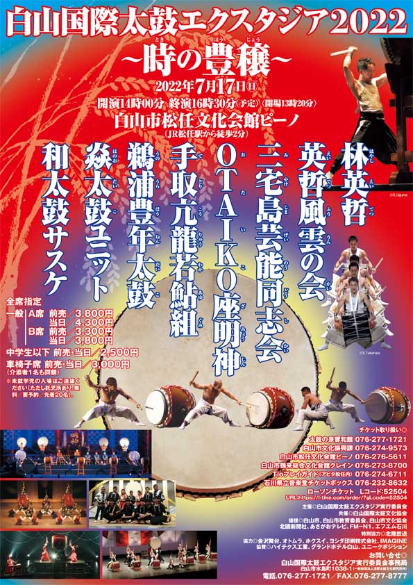 チケット:太鼓の泉響和館076-277-1721、白山市文化振興課076-274-9573、白山市松任文化会館ピーノ076-276-5611、他