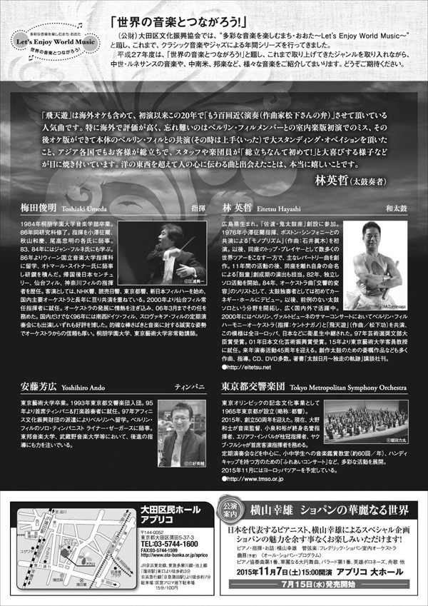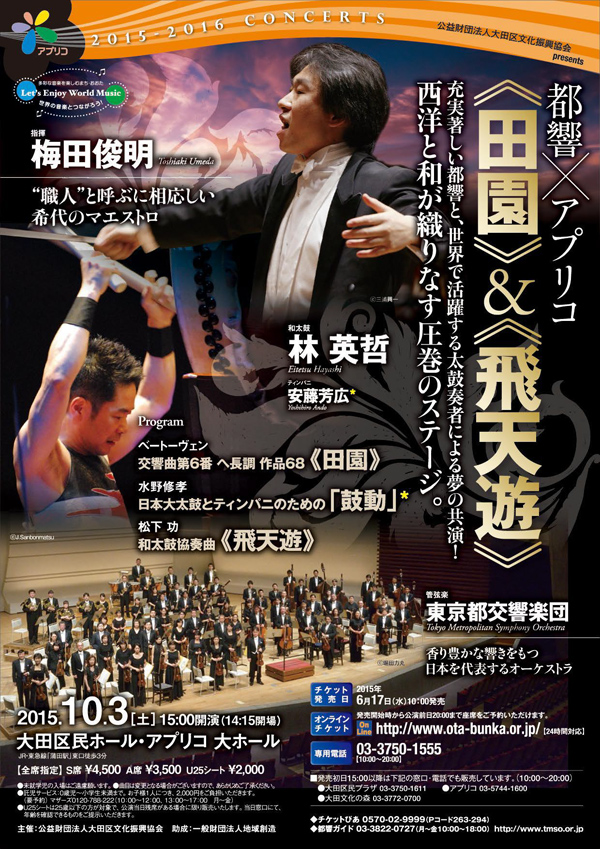 会場:東京・大田区民ホール・アプリコ 大ホール 開演:15:00 開演 出演:指揮:梅田俊明 和太鼓:林 英哲 ティンパニ:安藤芳広 管弦楽:東京都交響楽団 問い合わせ:大田区民ホール・アプリコ 03-5744-1600