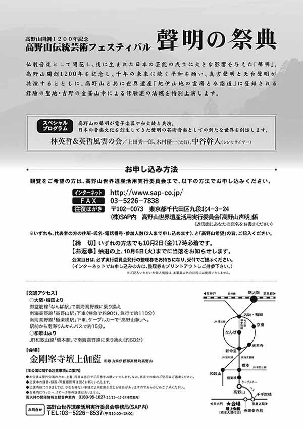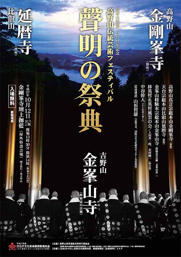 会場:高野山 金剛峯寺壇上伽藍(屋外特設会場)※雨天決行、嵐天中止 開演:14:00開演 出演:総本山金剛峯寺の聲明、比叡山延暦寺の聲明、金峯山寺の修験の芸能、ゲスト:林 英哲、英哲風雲の会〈上田秀一郎、木村優一〉、中谷幹人(シンセサイザー) 問い合わせ:高野山世界遺産活用実行委員会事務局(SAP内) 03-5226-8537(平日10:00~18:00)