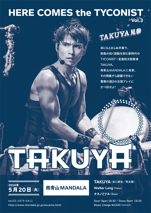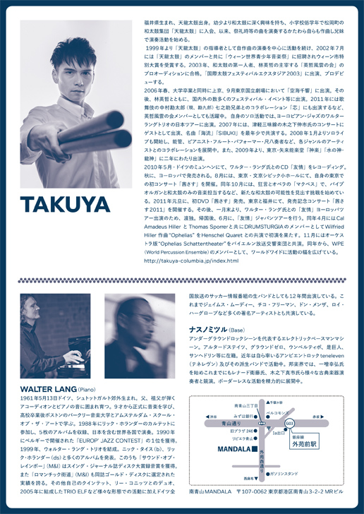 出演:TAKUYA(谷口卓也 / 和太鼓) Walter Lang (Piano) ナスノミツル(B)