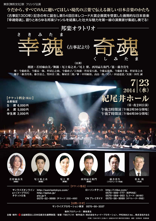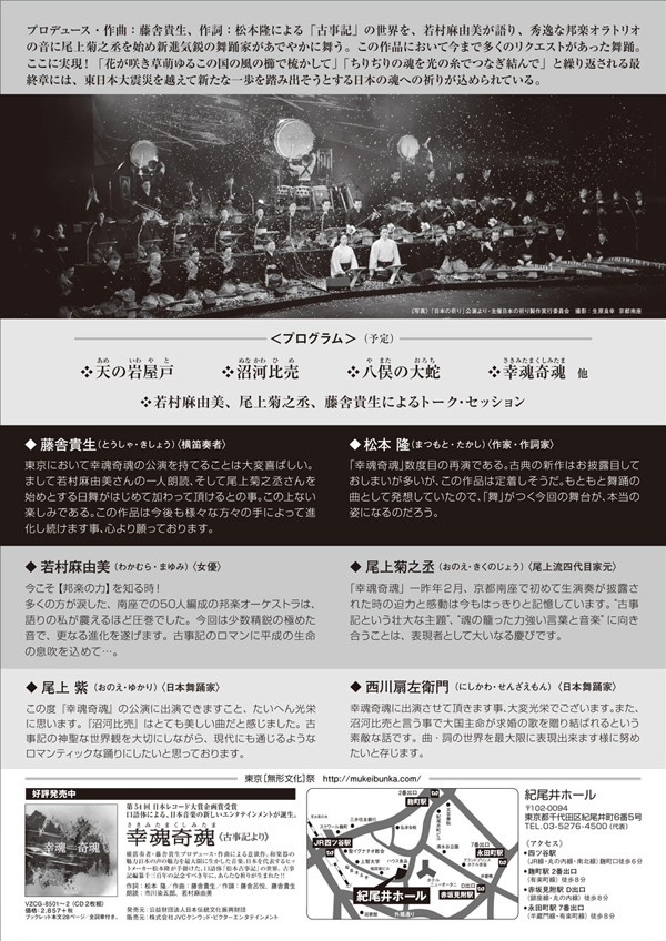 2012年京都南座での初演以後、小編成での公演は多数ありましたが今回は演奏家は勿論、舞踊家の方も参加ということであり南座とはまた違った「幸魂奇魂」になることでしょう。