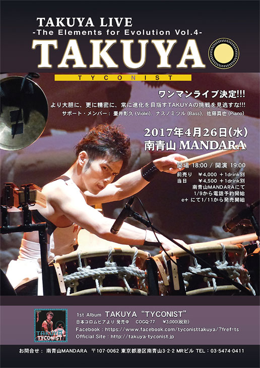 谷口卓也 出演TAKUYA LIVE The Elements for Evolution Vol.4日時:2017年4月26日(水) 18:00開場 19:00開演 |