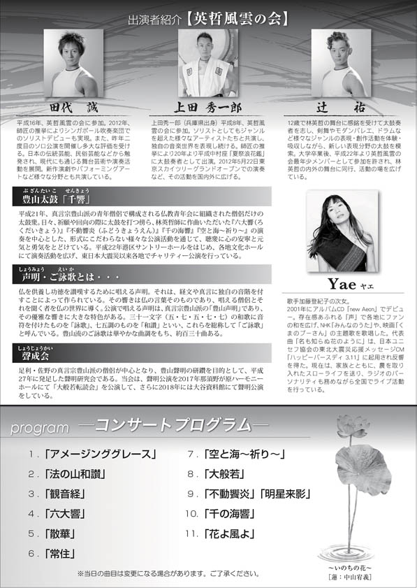 出演:豊山太鼓 千響・聲成会、英哲風雲の会(上田秀一郎、田代誠、辻祐)、Yae
