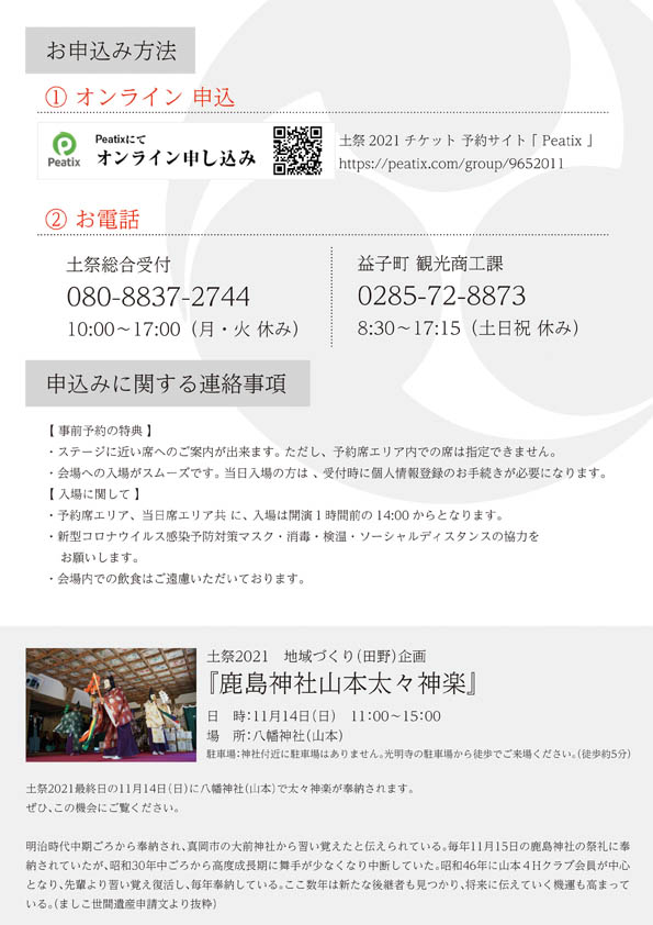 ―土祭クロージング企画― 日時:2021年11月14日(日)15:00~16:00(開場14:00) 会場:土祭広場「土舞台」 出演:英哲風雲の会(上田秀一郎、田代誠、辻祐)、天人疾風の会 進行:林英哲 料金:無料 申込:事前予約200名/当日100名 ※当日入場の整理券配布を、当日13:00から土広場駐車場で行います。 お申込み方法は、上部チラシをご覧ください。 問合せ:土祭総合受付(10:00~17:00)080-8837-2744